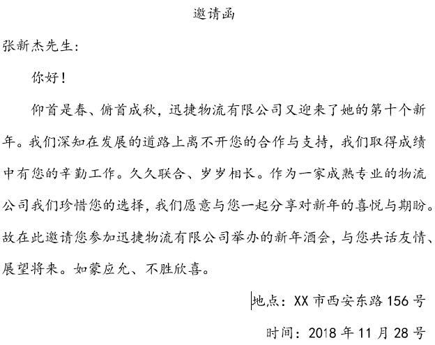 3.对齐方式设置:“邀请函”三个字居中对齐(4 分);称呼采用左对齐(4 分);落款地 点和时间采用右对齐(4 分)。