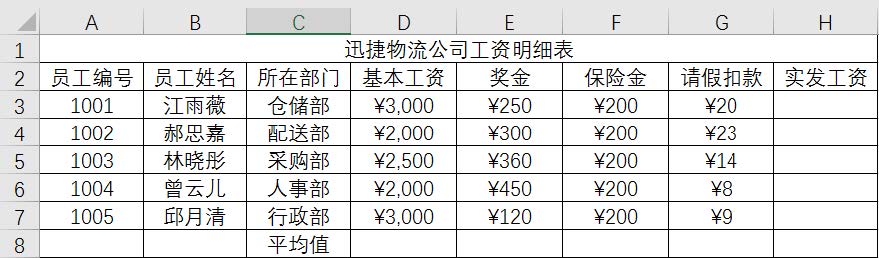 3.数据计算:按照“实发工资=基本工资+奖金-保险金-请假扣款”的原则计算每个员工的 实发工资(4 分);在每个工资项目的下方计算该项目的平均值,只保留整数(4 分)。