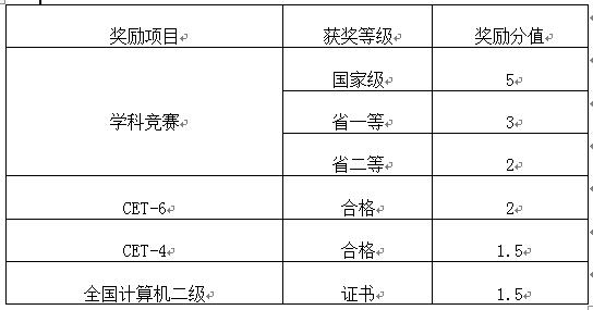 3.凡符合选拔基本条件的专科生在校期间以就读学校作为第一参赛单位,在学科竞赛项目中获奖者(集体项目最多计前三名,国家级分别按5、4、3计分;省一等分别按3、2、1.5计分;省二等分别按2、1.5、1计分);CET-6、CET-4成绩高于425分者(二者就高);非计算机专业全国计算机二级证书获得者;按下表给予奖励分,该类奖励专项加分最高计5分。