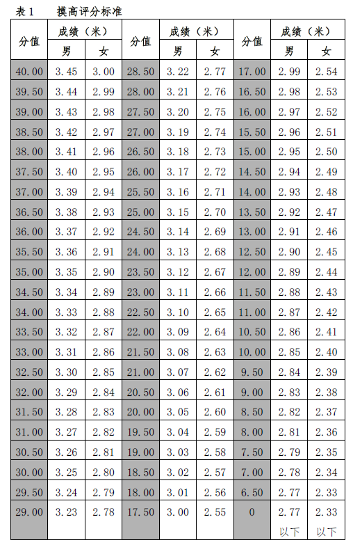 1.助跑单脚起跳摸高 考试方法:考生助跑单脚起跳摸高,单手触摸电子摸高器或有固定标尺的高物,记录绝对高度。 助跑距离和起跳方式不限。每人测试 2 次,取最好成绩(精确到厘米)。