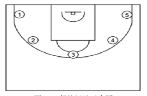 (1)考试方法:如图所示,在以篮圈中心投影点为圆心,5.5 米 为半径所划的弧线上设置五个投篮点(球场两侧 0 度角处、两侧 45度处和正面弧顶),每个点位放置 4 个球,共 20 个球。考生须从第 1投篮点或第 5 投篮点开始投篮,按逆时针或顺时针方向依次投完每个点位的 4 个球。测试时间为 90 秒。要求考生必须在弧线外投篮, 球出手前双脚不得踩线,若踩线投中则计为无效投篮,不得分。每人 测试 2 次,取最好成绩。