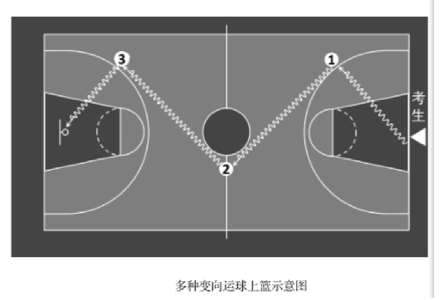 (1)考试方法:如图所示,考生在球场端线中点外出发区持球站 立,当其身体任意部位穿过端线外沿的垂直面时开始计时。考生用右 手运球至①处,在①处做右手背后运球,换左手向②处运球,至②处 做左手后转身运球,换右手运球至③处,在③处做右手胯下运球后右 手上篮。球中篮后方可用左手运球返回③处,在③处做左手背后运球, 换右手向②处运球,在②处做右手后转身运球,换左手向①处运球, 在①处做左手胯下运球后左手上篮。球中后做同样的动作再重复一 次,最后一次上篮命中后,持球冲出端线,考生身体任意部位穿过端线外沿垂直面时停止计时,记录完成的时间。每人测试 2 次,取最 好成绩。